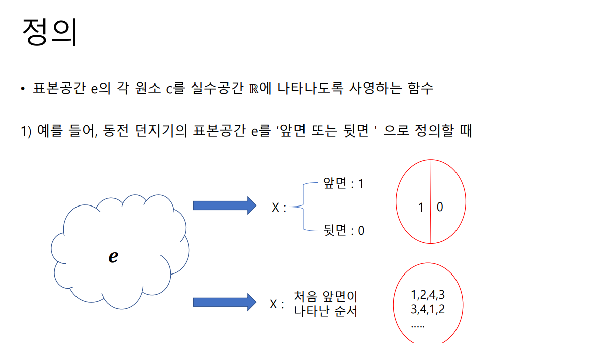 - 표본의 공간을 e라고 정의할 때, 공간에 속하는 각 원소 c를 실수공간 ℝ에 나타나도록 사영(Projection)하는 함수