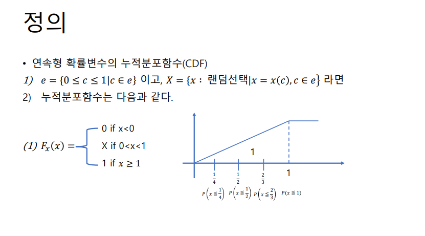 1) 구간의 개념이 포함되어 있기 때문에, 어떤 특정 점(Point)이 정확히 나타날 확률은 오히려 0임 - 누적분포함수(CDF) : 이산형 / 연속형 확률변수의 확률적인 누적을 나타내는 함수