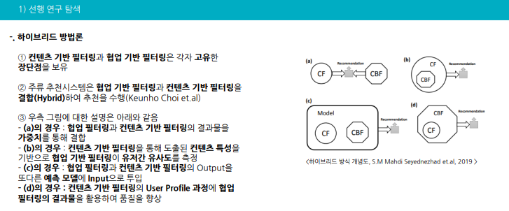 -. 이 둘을 결합하여 콜드스타트 문제를 해결하면서도 더 만족도가 높은 추천시스템을 만들려는 노력이 이어지고 있음