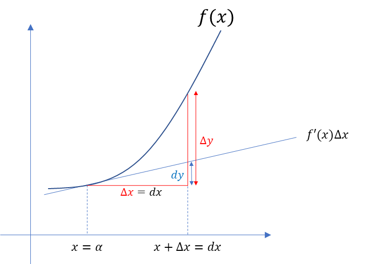 4) 정의역 x의 변화량은 $\Delta x = dx$로 같지만, y의 변화량은 $\Delta y$와 $dy$가 그 오차만큼 차이가 난다.