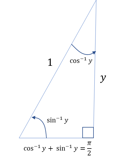 arcsin과 arccos이 만나는 모든 지점에서 정의역 $arcsin(y) + arccos(y) = \frac{\pi}{2}$이 된다. 삼각형의 성질과 삼각함수의 성질에 따라, $sin^{-1}$과 $cos^{-1}$의 합은 직각이며, 삼각함수로 표현하면 이는 $\frac{pi}{2}$가 된다.