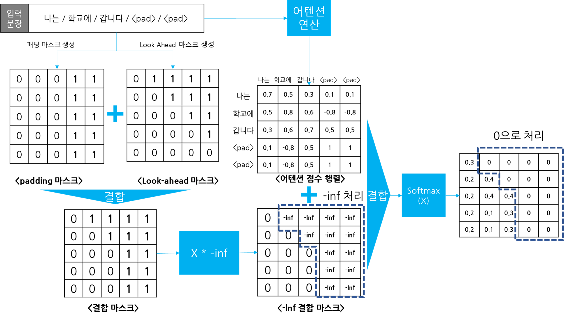 -. 구체적으로는 Attention Layer 내에서 어텐션 스코어를 구한 뒤 패딩 or 미래의 시퀀스의 자리에는 음의 무한대(-InF)를 곱함 => 'softmax 함수 통과'시 자연스럽게 0으로 처리되도록 유도