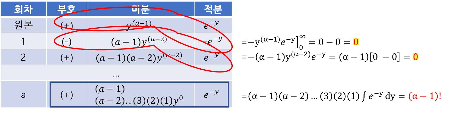 최후의 항에 대하여 $\int_{0}^{\infty}e^{-y}dy = 1$ 이므로, 상수항에 대한 $(\alpha-1)!$만 남는다.