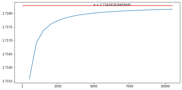 -. 연산을 하면, 이 함수의 극한은 자연상수 $e = 2.71828182..$로 접근하는 것을 확인할 수 있다.