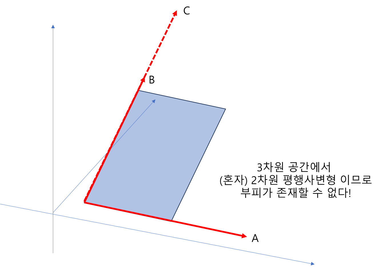 한개의 축이 소실되고, 따라서 평행육면체로서 부피를 가질 수 없다.