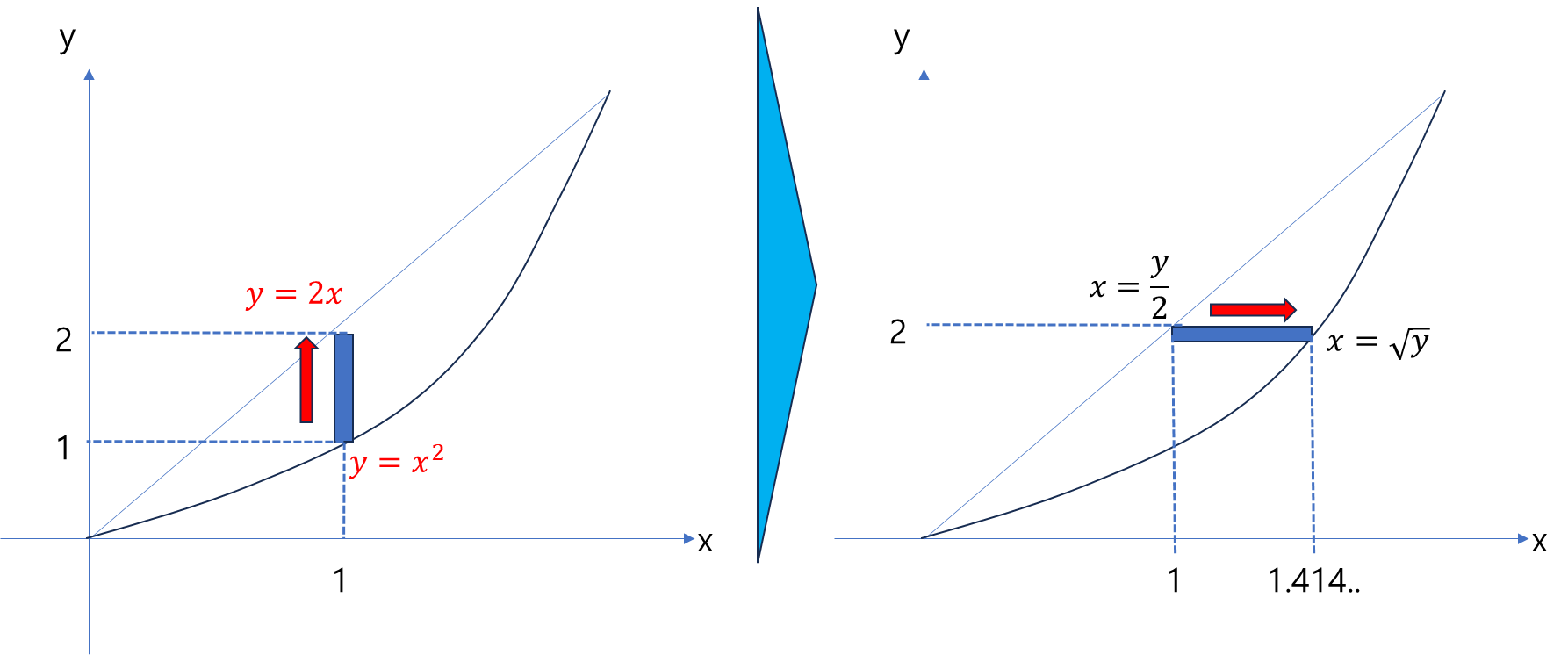 내외 적분을 교환한 $ \int_{0}^{4}\int_{y=\sqrt{y}}^{\frac{y}{2}} x^{3}dxdy$는 가로 방향의 직사각형으로 적분을 시작한다.
