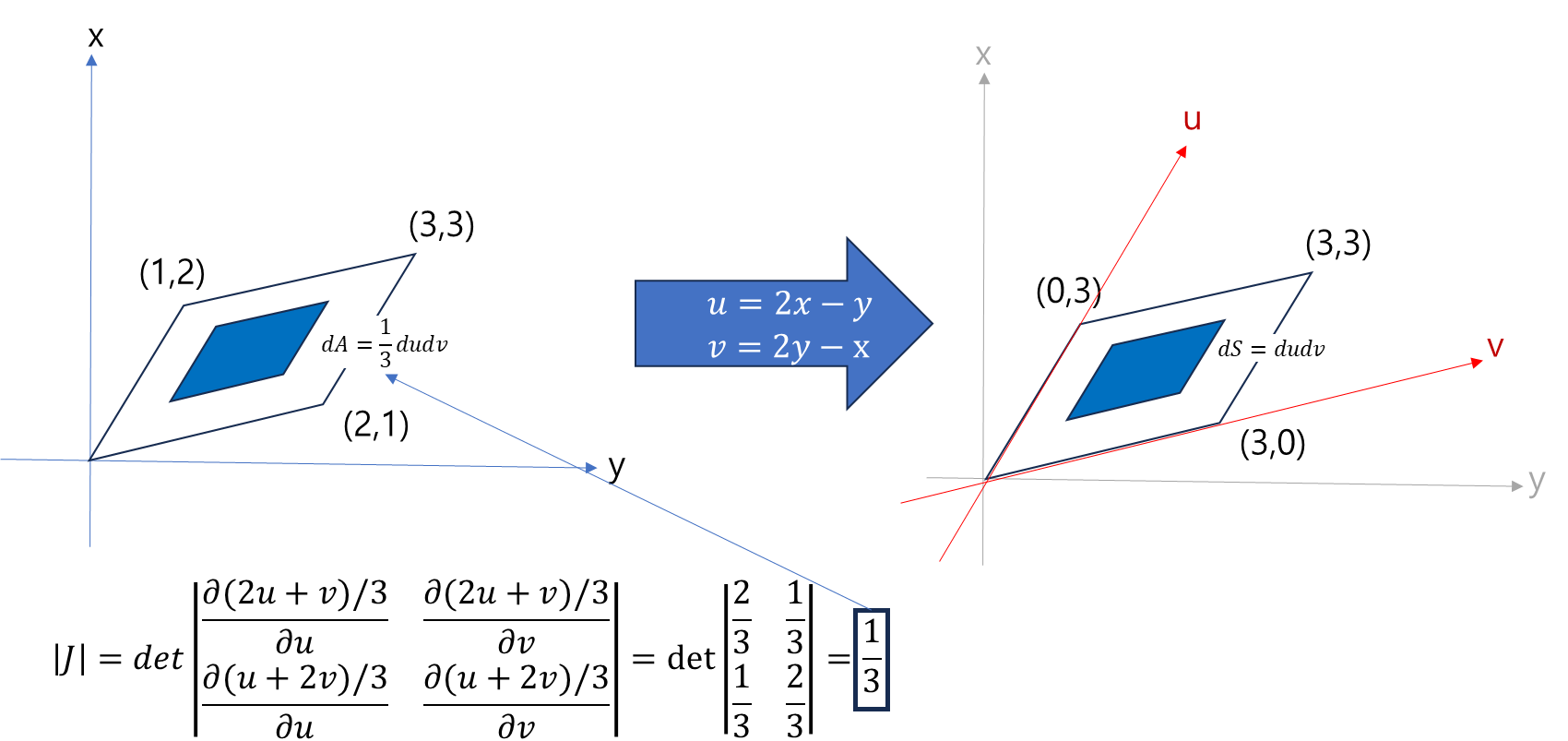 이 때, 표준 좌표계에서 (u,v) 좌표계로 변환될 때 평행사변형의 부피는 $\frac{1}{3}$만큼 축소되며, 이것이 바로