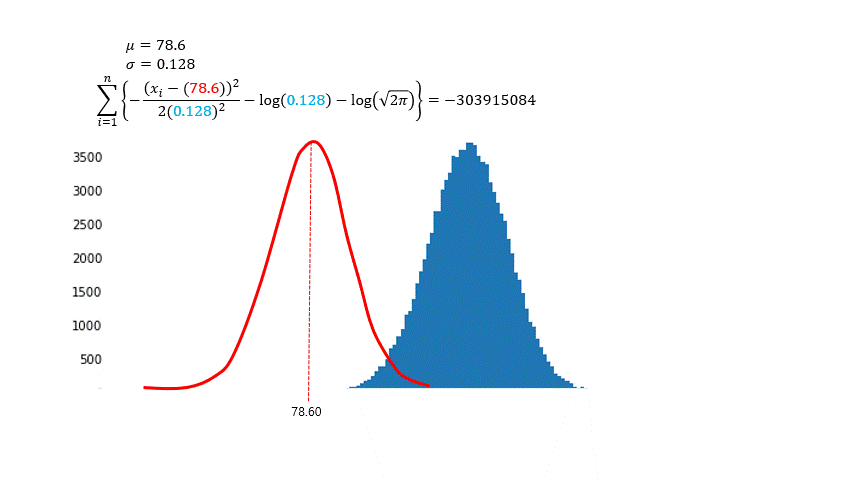 평균을 78.6 -> 86.6 -> 88.6 -> 90.6 으로 움직이면서 우도(로그우도)를 계산하면