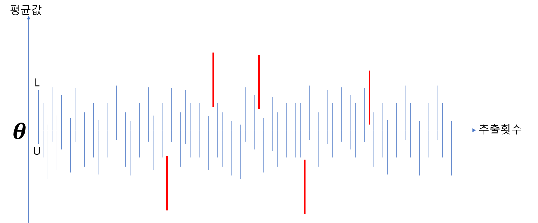 각각의 추출마다 $[X_{1}, X_{2}, ..., X_{n}]$를 이용하여 신뢰구간 L과 U를(이용한 파란색 선분을) 구할 수 있다.