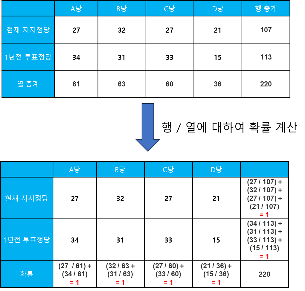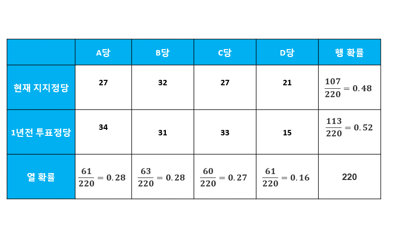 $P_{A당, 현재지지정당} = P(A당 \cap 현재지지정당)$이 때, 이 실험이 n번 반복되었다고 가정하고, $P_{i.} = P(A_{i}), P_{.j} = P(B_{j})$라고 정의하자.