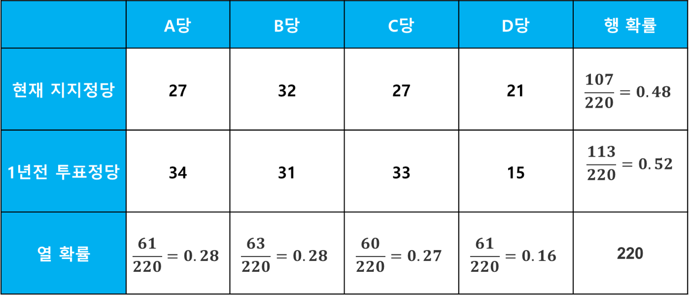 $P_{A당, 현재지지정당} = P(A당 \cap 현재지지정당)$이 때, 이 실험이 n번 반복되었다고 가정하고, $P_{i.} = P(A_{i}), P_{.j} = P(B_{j})$라고 정의하자.
