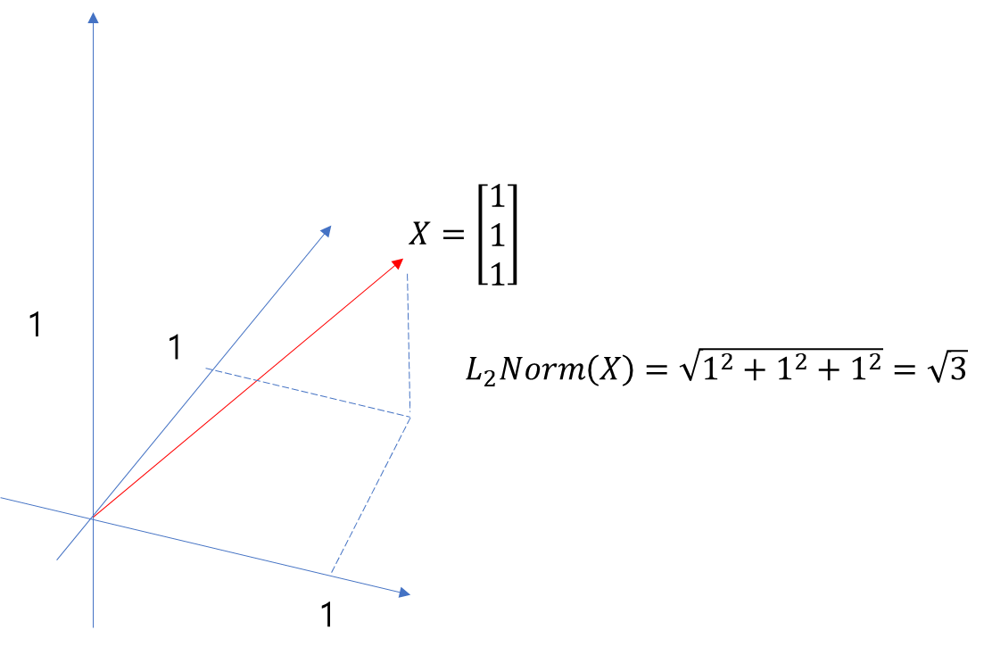 3차원 공간에서 정의된 벡터 X에 대해 '최단 거리 크기'를 알고 싶다면 L2 Norm을 사용한다.