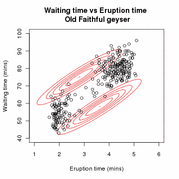 올드페이스풀 간헐천 데이터에 대하여 GMM을 이용한 클러스터링을 시도하는 애니메이션.