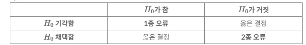 1) 가설검정엔 오류의 종류에 따라 1종오류와 2종오류로 분류할 수 있다.